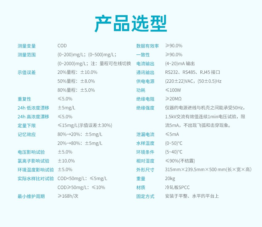 适用场合:COD水质在线分析仪采用重铬酸盐法检测,符合《化学需氧量(CODCr)水质在线自动监测仪技术要求及检测方法》(HJ 377)、《水质 化学需氧量的测定 重铬酸盐法》(HJ 828)和《水质化学需氧量的测定 快速消解分光光度法》(HJ/T 399)、《污染物在线自动监控(监测)系统数据传输标准》(HJ 212)、《地表水自动监测仪器通信协议技术规定》等标准和规范的要求。
