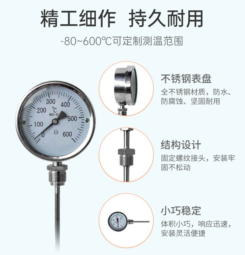适用场合:杭州米科仪表专业生产不锈钢径向、轴向、万向工业用双金属温度计可用于窑炉、烤箱、管道,测量气体、液体、蒸汽的温度