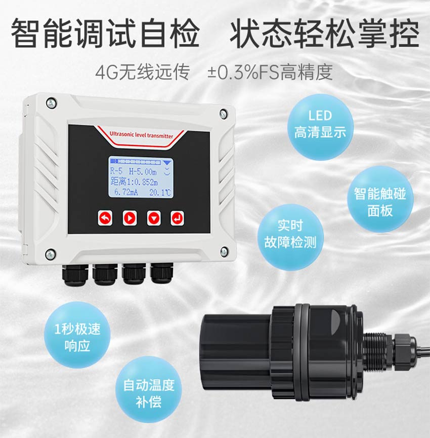 适用场合:本超声波液位计是我司研制的一款高集成度的液位/物位测量仪器。它具有高可靠、无污染、性能稳定、不接触工业介质就能满足大部分液位、料位测量要求,解决了压力式、电容式、浮子式等传统测量方式带来的缠绕、堵塞、泄露、介质腐蚀、维护不便等缺点。常见的应用工况,如市政、化工、储运等工业环境中的河流、水池、储罐等液位测量。