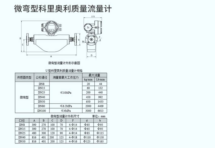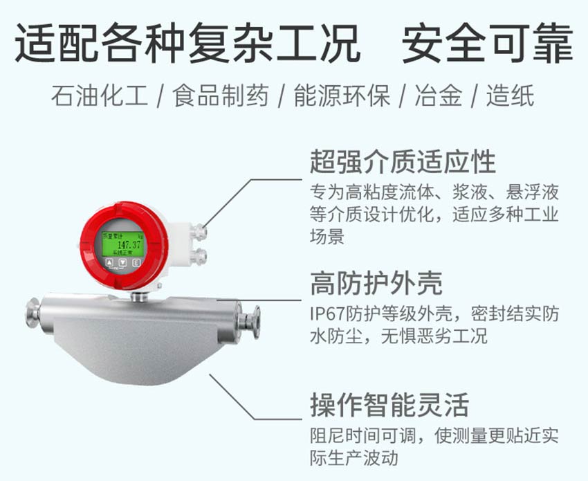 适用场合:科里奥利质量流量计是根据科里奥利力原理开发的一种新型的流量测量仪表,可直接测量封闭管道内流体的质量流量、介质的密度和温度。可广泛应用于化工、石油、食品、制药、造纸等行业。
